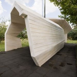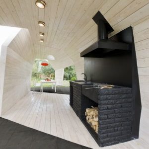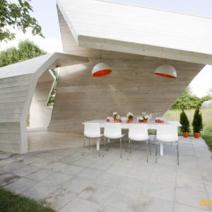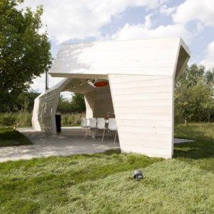 Самонесущая конструкция состоит из 14 плоскостей, образующих спираль. В основной части «волны» разместили большой обеденный стол, за которым свободно разместятся десять человек. Вторая половина беседки – кирпичный мангал. Разделяет зоны воздушный зазор, делающий конструкцию свободной и открытой.
