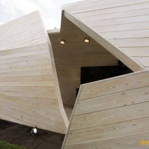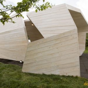 Нам хотелось создать сложную динамичную конструкцию, которая бы не только выполняла функции беседки и площадки для застолий, но и не нарушала сложившийся контекст участка. Несмотря на то что проект представляет собой довольно сложную структуру из четырнадцати плоских сегментов, мы использовали нейтральные цвета и натуральное дерево лиственницы. Это помогает, с одной стороны, эффектно подать объект и выделить его конструкцивные особенности, а с другой – не вырывать его из сложившегося дачного контекста, растворить в зелени сада, чтобы он радовал глаз, но ни в коем случае не резал. Грани беседки отлично защищают пространство внутри от ветра и осадков, так что, надеемся, хозяева смогут использовать ее не только летом, но и зимой.