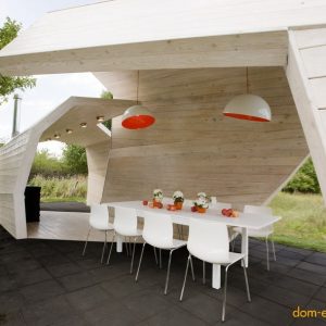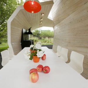 Строительство подобного архитектурного объекта на обычной даче – дело неоднозначное, многим оно покажется неуместным. Однако архитекторы сумели вписать футуристическую беседку в окружающее пространство: приглушил диссонанс архитектурного объема и окружения белый цвет, в который тонировали лиственницу. К тому же летом, когда беседка используется хозяевами, она утопает в цветущих деревьях. Яблочная тема в сервировке и соответствующие цвета абажуров тоже призваны связать воедино детали ландшафта.