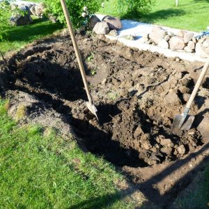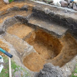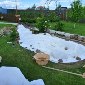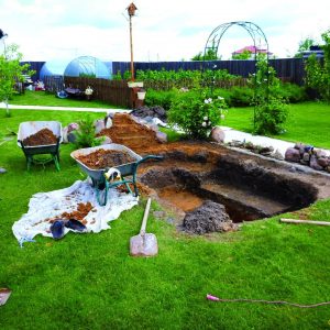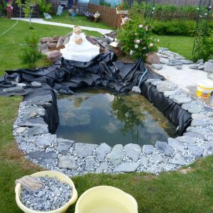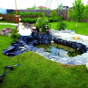 Вариантов множество, но принцип устройства у любой декоративной водной системы один. Для начала необходимо разметить территорию, на которой будет располагаться водоем. После по форме намеченных границ вырывается котлован (возможно, со ступенями – для удобства спуска в воду либо для высадки растений). Он может быть различных размеров: для маленького прудика достаточно 1,5 м глубины, а для плавательного водоема необходимая глубина составляет от 2 м и более. Длина и ширина могут быть совершенно различными, но, как правило, площадь водяного зеркала составляет от 8 м2. После того как готова яма, на дно необходимо засыпать увлажненный песок, слоем 5-15 см. Это поможет защитить основание водоема от механических повреждений.