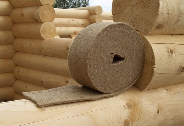 Наиболее часто для утепления используется джутовый войлок в рулонах. Лента войлока разворачивается на поверхности бревна и крепится степлером.