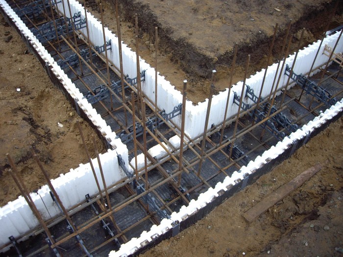 Для сохранения заданной геометрии полистирольные блоки снаружи усиливаются металлическим каркасом, собранным из поперечных и продольных металлических прутов. Чаще всего для создания остова используется арматура с диаметром 8 – 10 мм.