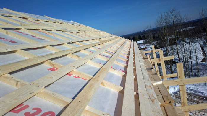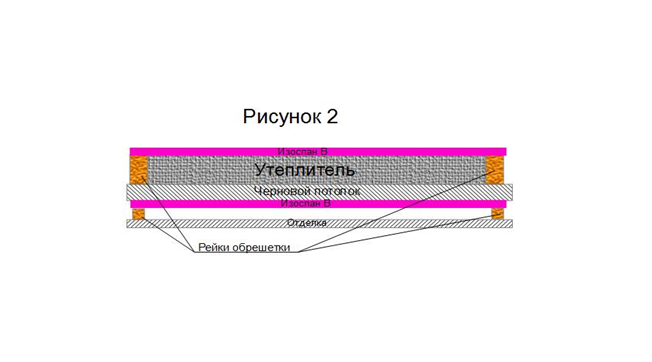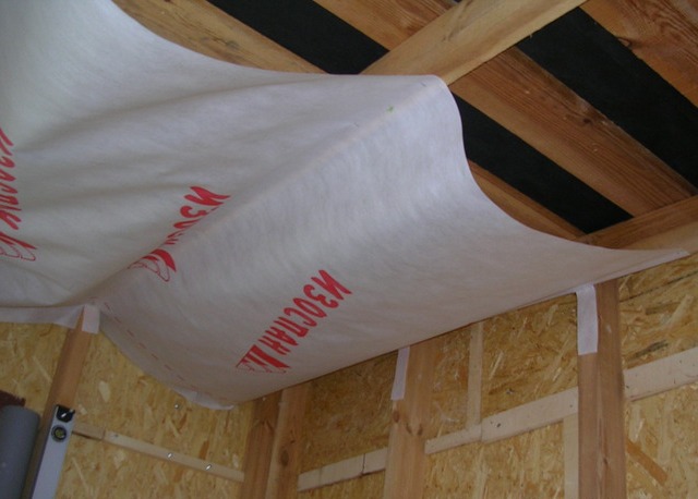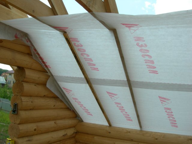 Далее понадобится уложить еще один слой Изоспана В гладкой стороной к утеплителю, закрепить его к обрешетке и загерметизировать стыки.