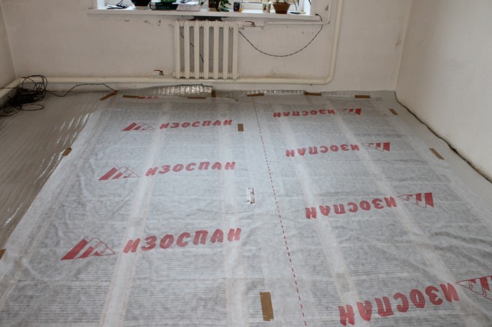 - закрепить первую ленту шершавой стороной к черновому потолку (полу) с помощью степлера или гвоздей;