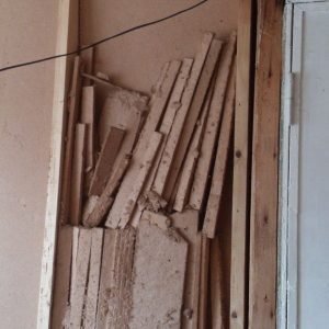 До того как разводить трубы отопления и навешивать радиаторы, были утеплены стены дома. Вскрыв фанеру, я наконец-то увидел, что за утеплитель находится в стенах «финских» домиков. Это оказались 3 слоя мягкого ДВП толщиной 18мм, установленное в каркас в распор в несколько слоев с воздушными прослойками. Без пароизоляции. По тем временам такое утепление, может быть, и нормальным считалось, тем более, что эти щитовые домики предназначались для временного проживания. Но по современным меркам такие стены тепло не держат. Тем более вскрытие показало чью-то явную халтуру – некоторые секции каркаса были заполнены просто обрезками ДВП.