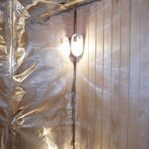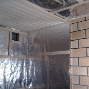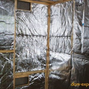 Для стен используют утеплитель 50 мм, для потолка – 100 мм. Далее, при помощи степлера стены обшиваются фольгой. Проще работать с фольгой, армированной ниткой на бумажной основе: при случайном надрыве она рвется до капроновой нити. Step48 предпочитает использовать толстую цельную фольгу.