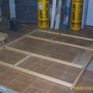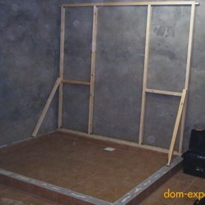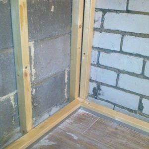 Каркас сауны, если позволяют размеры помещения, собирают на полу, в противном случае сразу крепят на стену. Чтобы защитить каркас от мокрого пола, мастер рекомендует ставить его на алюминиевый профиль, можно также приподнять его и закрепить на стене. Каркас собирают в виде квадрата, затем обшивают снаружи. Если сауну встраивают по месту, нередко делают двойной каркас: сначала к наружной стене крепят по вертикали брус 50 мм, который и задает вентиляционный зазор.