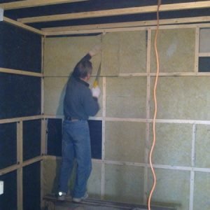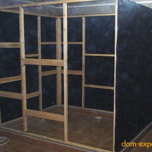 После все обшивается кровельной мембраной. Это необходимо для того, чтобы утеплитель не вываливался в вентиляционный зазор, и не попадала в него влага с наружной стены. Затем делается основной каркас сауны. У Step48 его размеры составляют 40х50 или 50х50 мм. Шаг равен ширине утеплителя минус один сантиметр. В качестве утеплителя форумчанин советует использовать жесткий базальтовый («каменную вату») или фольгированный «Изовер», фольгой наружу.