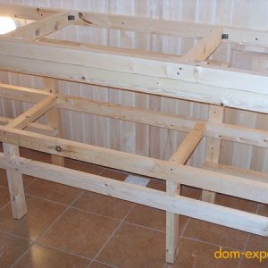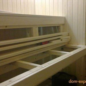 При устройстве лежаков необходимо установить закладные элементы в местах крепления каркаса к стенам сауны. Крепеж чистового покрытия полок выполняют таким образом, чтобы на лицевой поверхности отсутствовали следы металлических элементов крепления.
