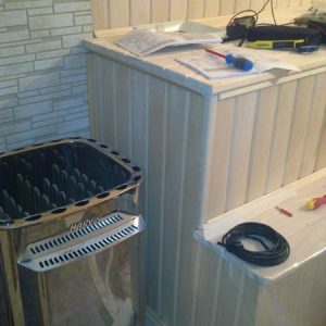 На заключительном этапе отделываются уголки, плинтуса, стыки. Параллельно вешают и подключают электрическую печь. В случае если панель управления выводится за пределы сауны, провода закладываются в стену до зашивки фольгой. Далее крепятся и закрываются абажурами светильники.