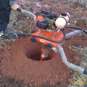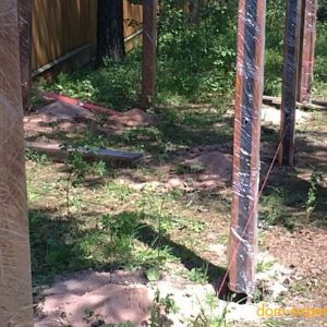 Следующий этап – бурение лунок под столбы. Проще всего взять мотобур в аренду (цена около $25-30 за сутки). Предварительно нужно сделать разметку мест бурения. Понадобится веревка и колышки, которые забиваются через 3м. Работу могут усложнить корни деревьев, строительный мусор, камни. Лучше иметь наготове лом и лопату. Лунки должны получиться глубиной примерно 1 м и диаметром 25 см.