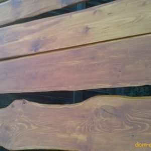 1. Самая трудоемкая часть работ – обработка необрезной доски. Проще всего купить пиломатериалы из сосны или ели. Обзол (кору) удобно снимать лопатой. Чтобы лицевая часть доски была не «мохнатой», её следует обработать шлифмашинкой. Минимальное зерно наждачки − 40. Одного диска хватает на 5-7 досок. Их сразу обрабатывают антисептиком, желательно в два слоя.