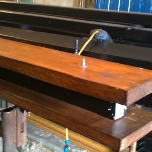 3. После полного высыхания в столбиках сверлятся сквозные отверстия с отступом от верха 10 см, 100см и 190см. Затем через эти отверстия делается разметка, и сверлятся сразу две обрезные доски (сверло 7).