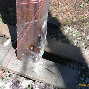 6. На дно лунок засыпается ПГС с трамбовкой, этой подсыпкой выводят все лунки на глубину 90 см. В них устанавливаются рубероидные гильзы. При установке нужно обеспечить фиксацию столба в вертикальном положении и залить бетоном. Бетон можно замешивать на месте, в бетономешалке.