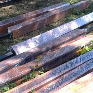 2. Потом можно приступать к подготовке столбиков. Куски арматуры по 20 см перпендикулярно привариваются к столбикам с отступом 10 см от верха и 60 см от низа. Столбики окрашиваются в два слоя.