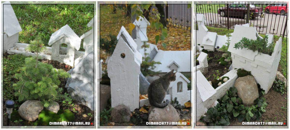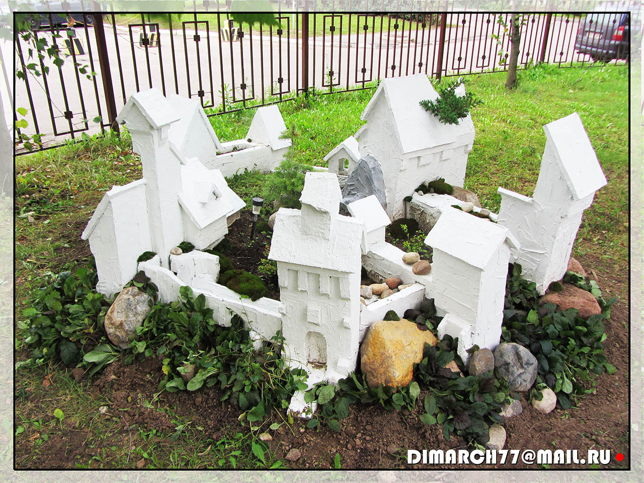 Эту технику Дмитрий отработал во дворе собственного жилого дома. При помощи кусков нарезанного упаковочного пенопласта и плиточного клея, он создал декоративный средневековый замковый ансамбль. Сооружение уже 4 года стоит под открытым небом и прекрасно сохранилось.