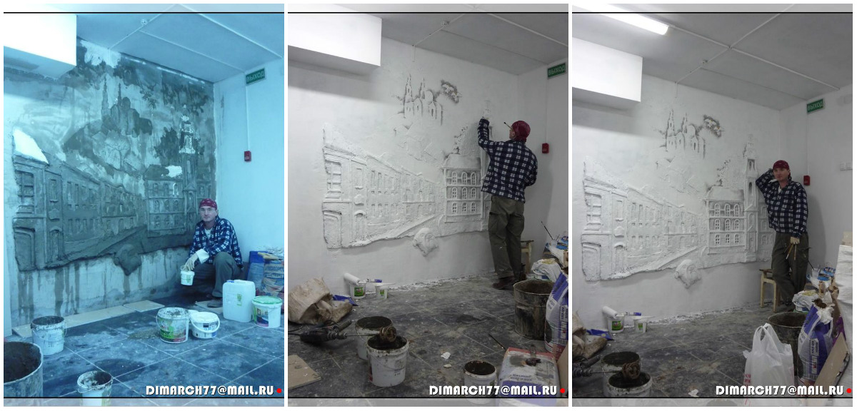 Первый рельеф Дмитрий создал 8 лет назад: знакомые арендовали подвальное помещение для переоборудования в спортклуб, и делали в нем ремонт. После завершения работ осталось много плиточного клея и Дмитрий, чтобы не выбрасывать материал, предложил вылепить на стене барельеф. Художественная школа и архитектурное образование помогли — хотя практического опыта у Дмитрия не было, «первый блин» вышел отнюдь не комом.