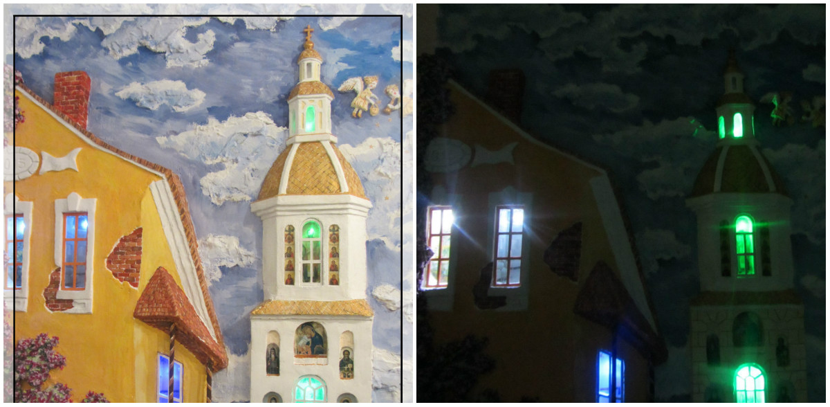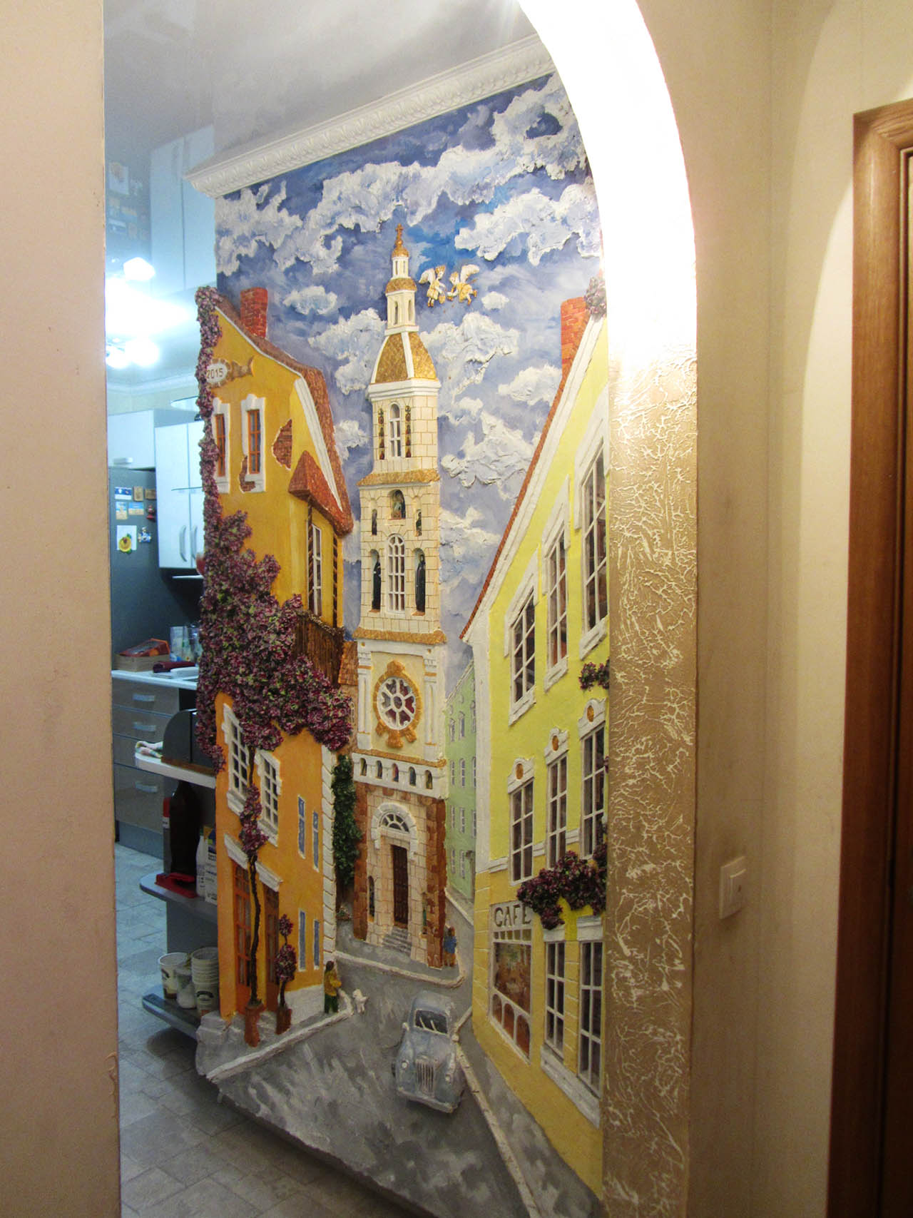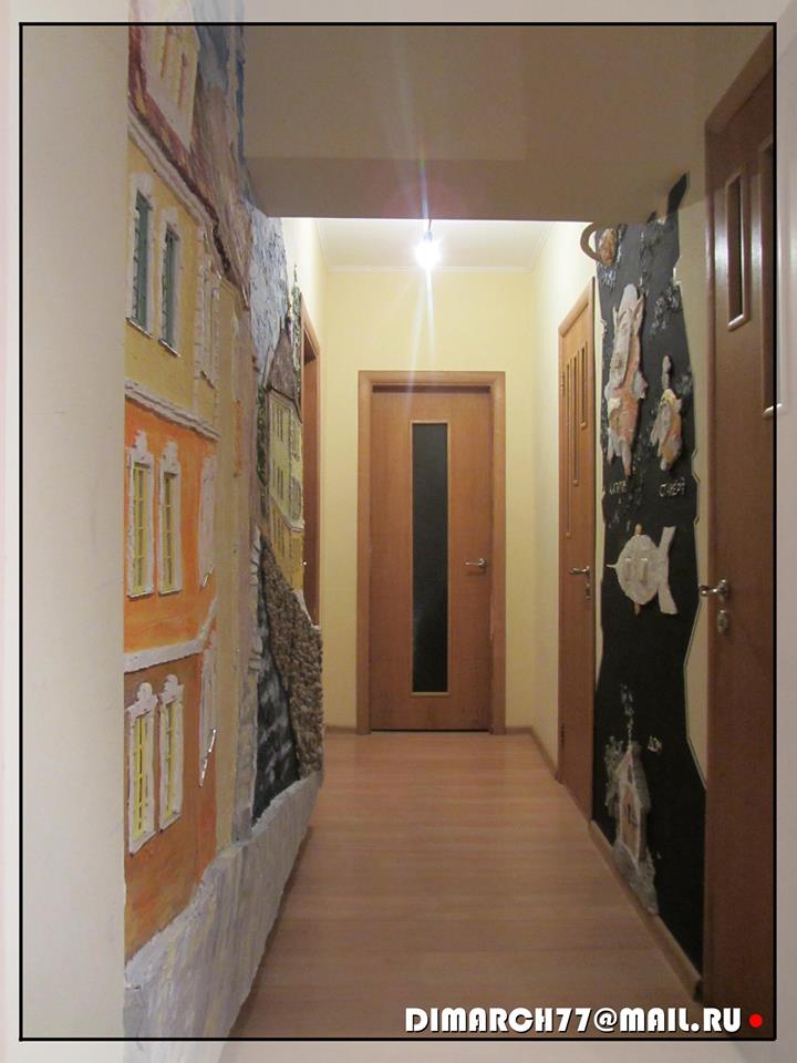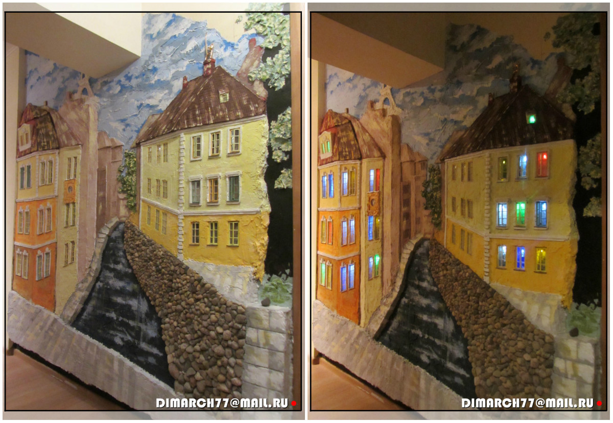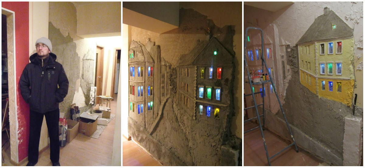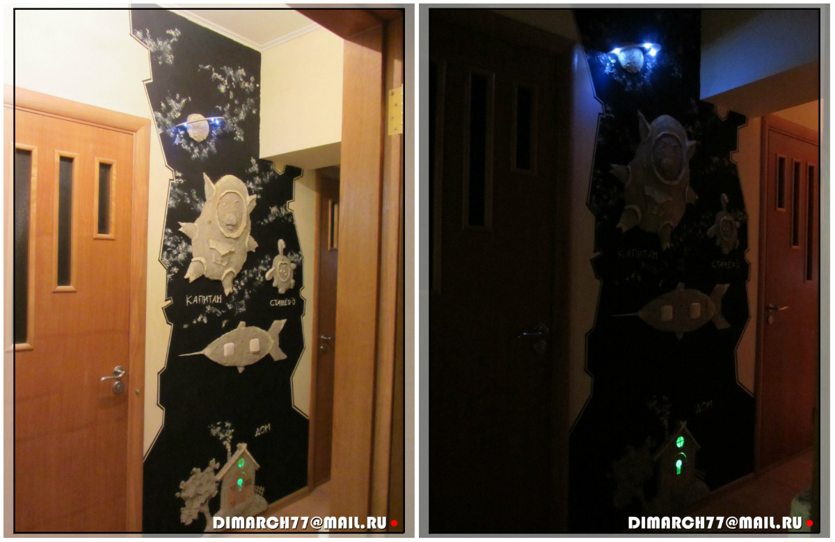 Не так давно Дмитрий перевел увлечение на новый уровень, и сделал несколько красиво оформленных барельефов: у себя в квартире и у соседей. В отличие от предыдущих работ, в этот раз он дополнил роспись «лепнины» еще и современной светодиодной подсветкой.