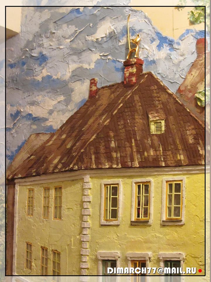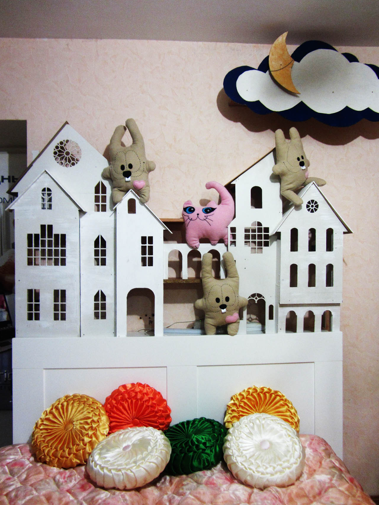 «Взаимоотношения» с фанерой у Дмитрия складывались похожим образом: после разбора старых кроватей остались два листа ДВП, и он решил: «не пропадать же добру». Первым опытом стал «Кошкин город», построенный над изголовьем кровати в спальне, на специальной полочке. Городок имеет четыре уровня: последний, самый высоко расположенный — прячется за облаком. В «городе» и по сей день живут две хозяйские кошки.