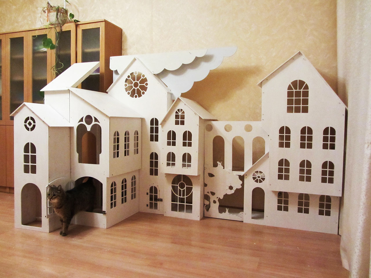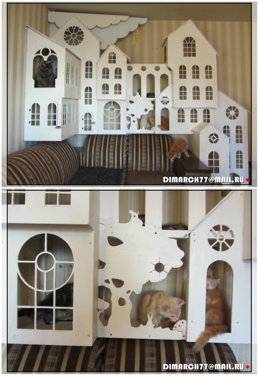 После того, как эти работы попали в Интернет, их увидели заводчики котов, и к Дмитрию стали обращаться с заказами. Тут уже фанеру пришлось покупать, но в результате появились еще более масштабные конструкции для домашних любимцев. Есть и своего рода «опции» (делаются по желанию заказчика) — в «городках» можно сделать открывающиеся дверцы, это еще и облегчает уборку.