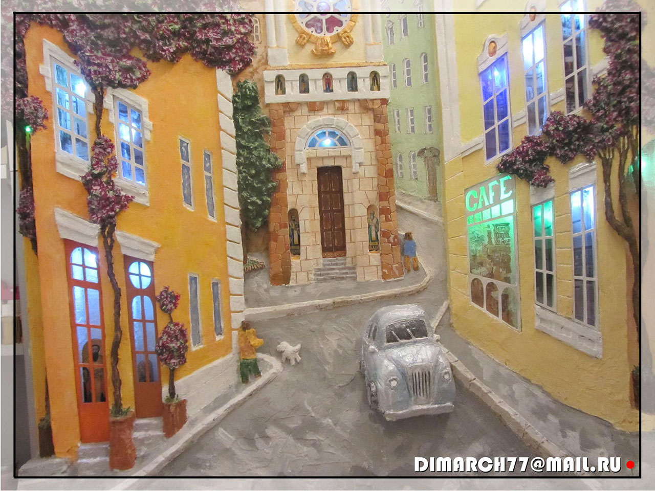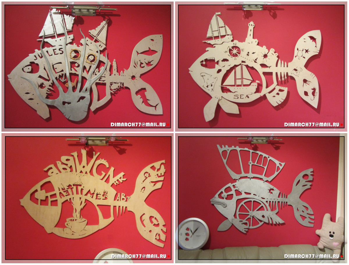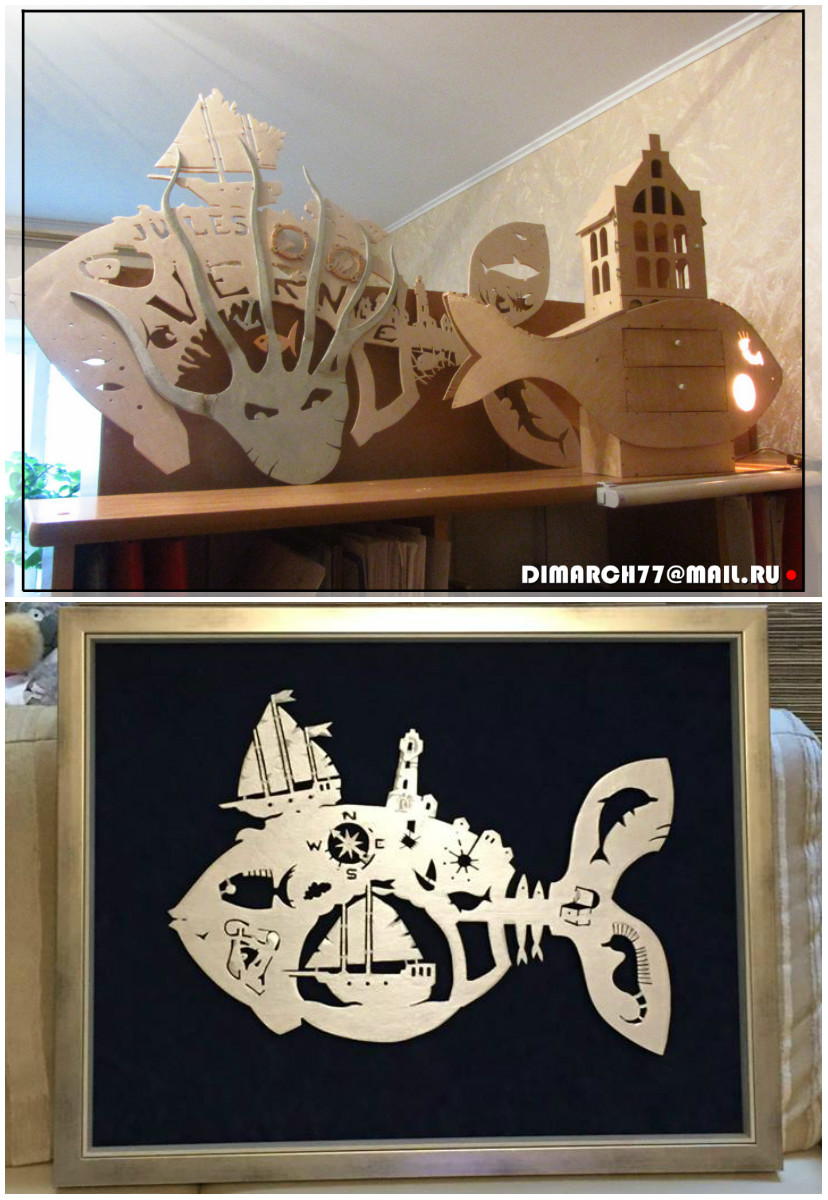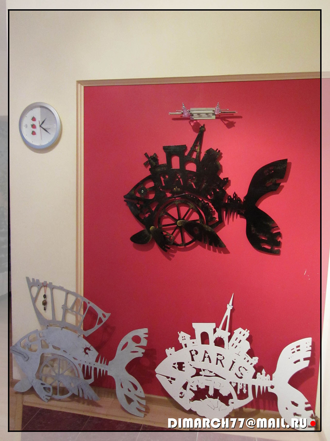«Потом увлекся и начал делать из фанеры еще и сувенирных рыб. Композиция со спрутом — дань Жюль Верну. С Парижем – памятный сувенир: я был в этом городе и он мне очень понравился, поэтому изобразил Триумфальную арку, Мулен-руж, реку Сенна и т.д.».