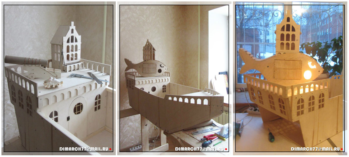 «Знакомый фотограф попросил собрать ему лодку для фото-зоны в студии. Но простую лодку мне было делать неинтересно, я ему сколотил вот такой «фрегат». А затем – еще и самолет. Клиент остался доволен». — рассказывает Дмитрий.