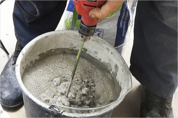 Приготовление клея своими руками потребует контейнера (ведро), дрель или специальный инструмент для перемешивания растворов, лопасть для ручного перемешивания и непосредственно сам сухой клей. Процесс состоит из нескольких этапов.