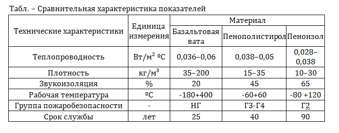 Сравним основные показатели теплоизолятора с основными конкурентами – базальтовой ватой и пенополистиролом.