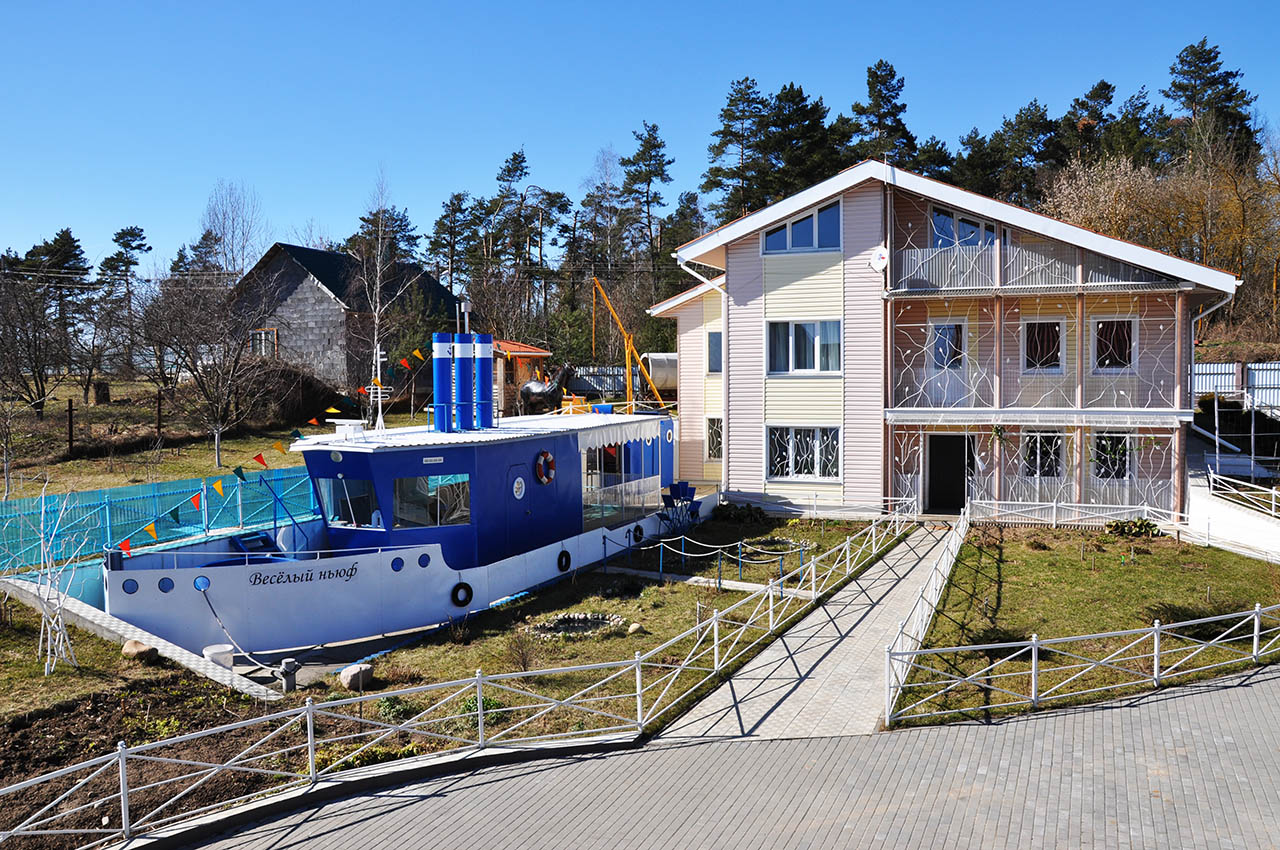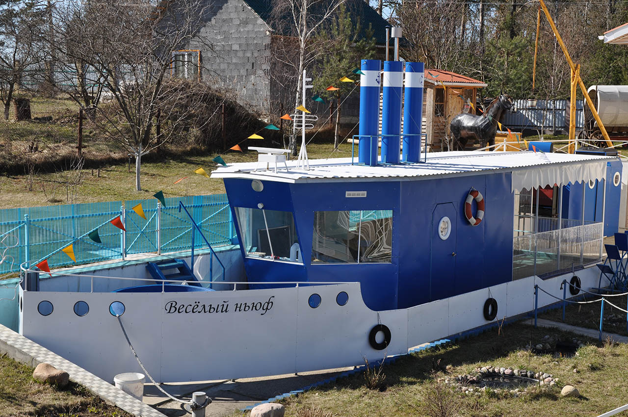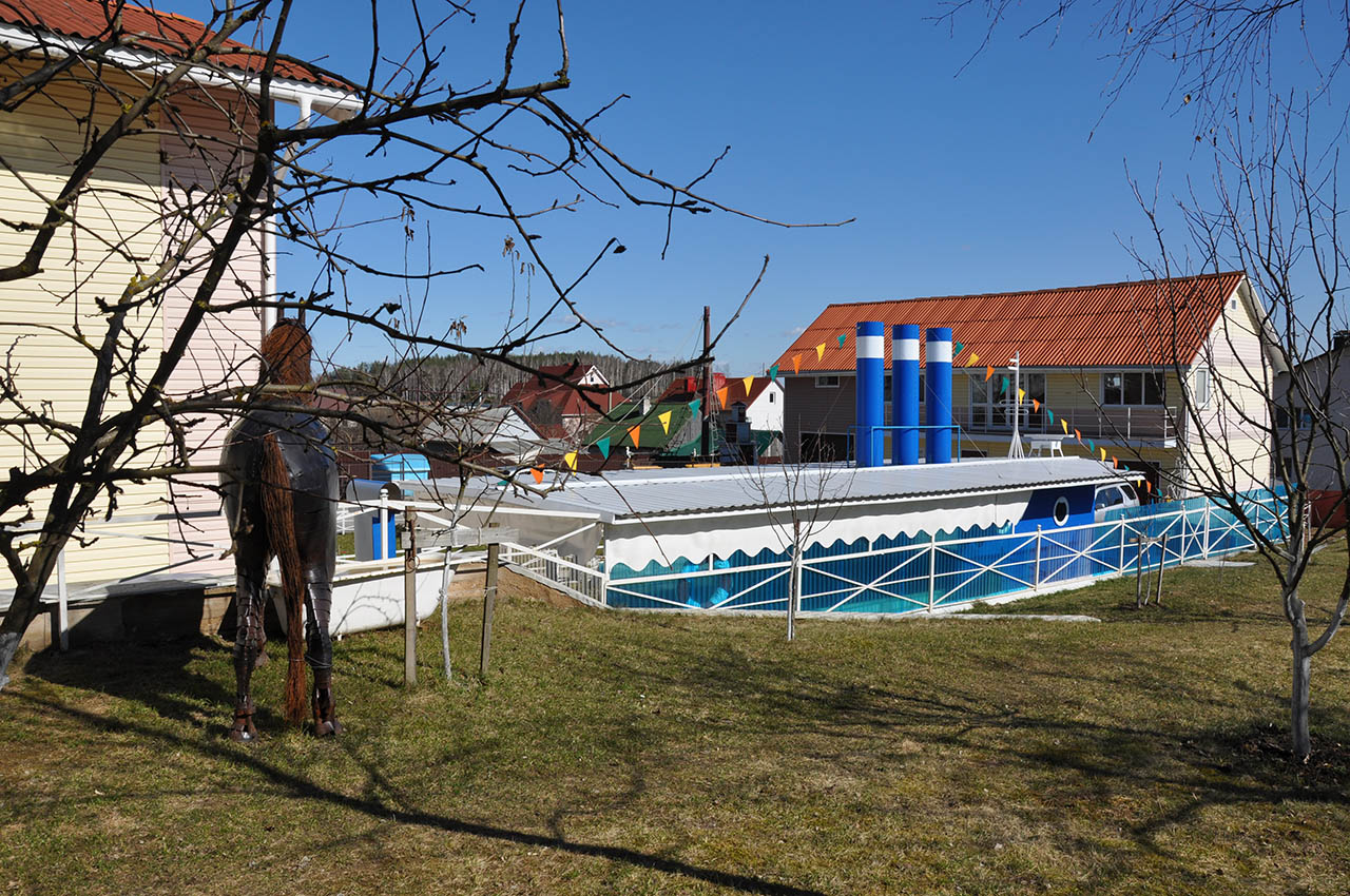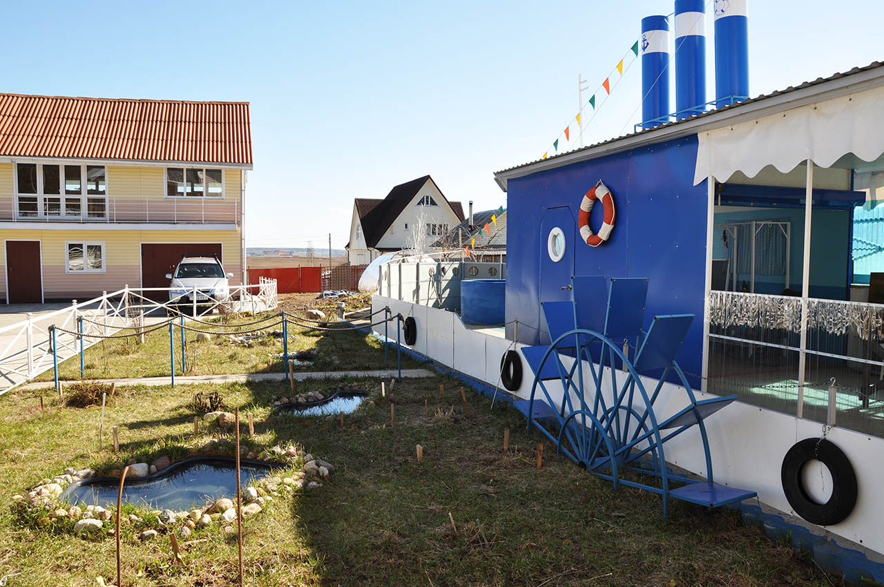 Импровизированный теплоход построен своими руками. Он выполняет функции декоративного ландшафтного элемента, летней террасы, барбекю-зоны и даже оснащен небольшим бассейном и душевой кабинкой.