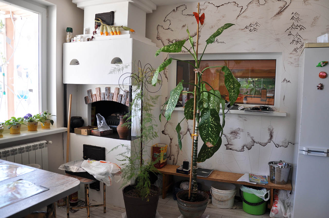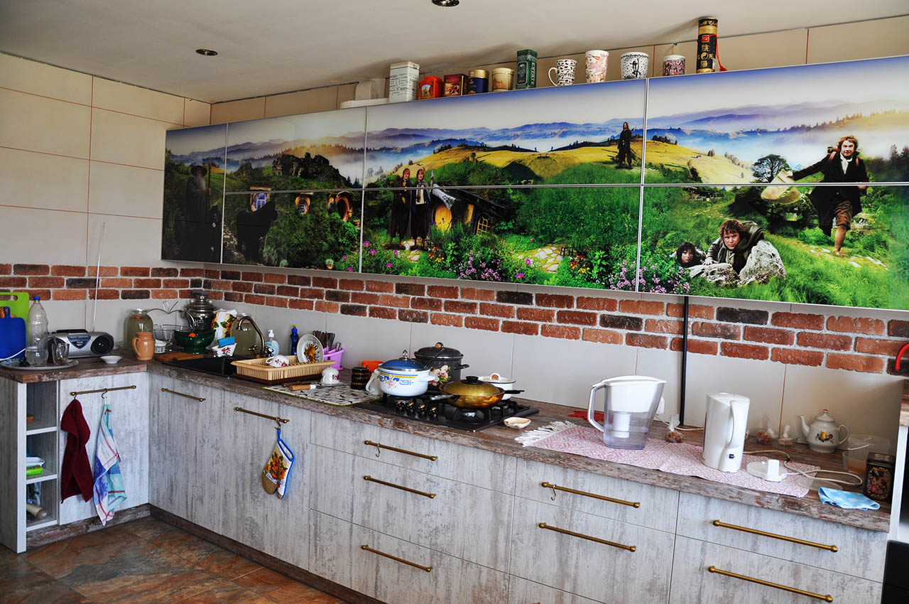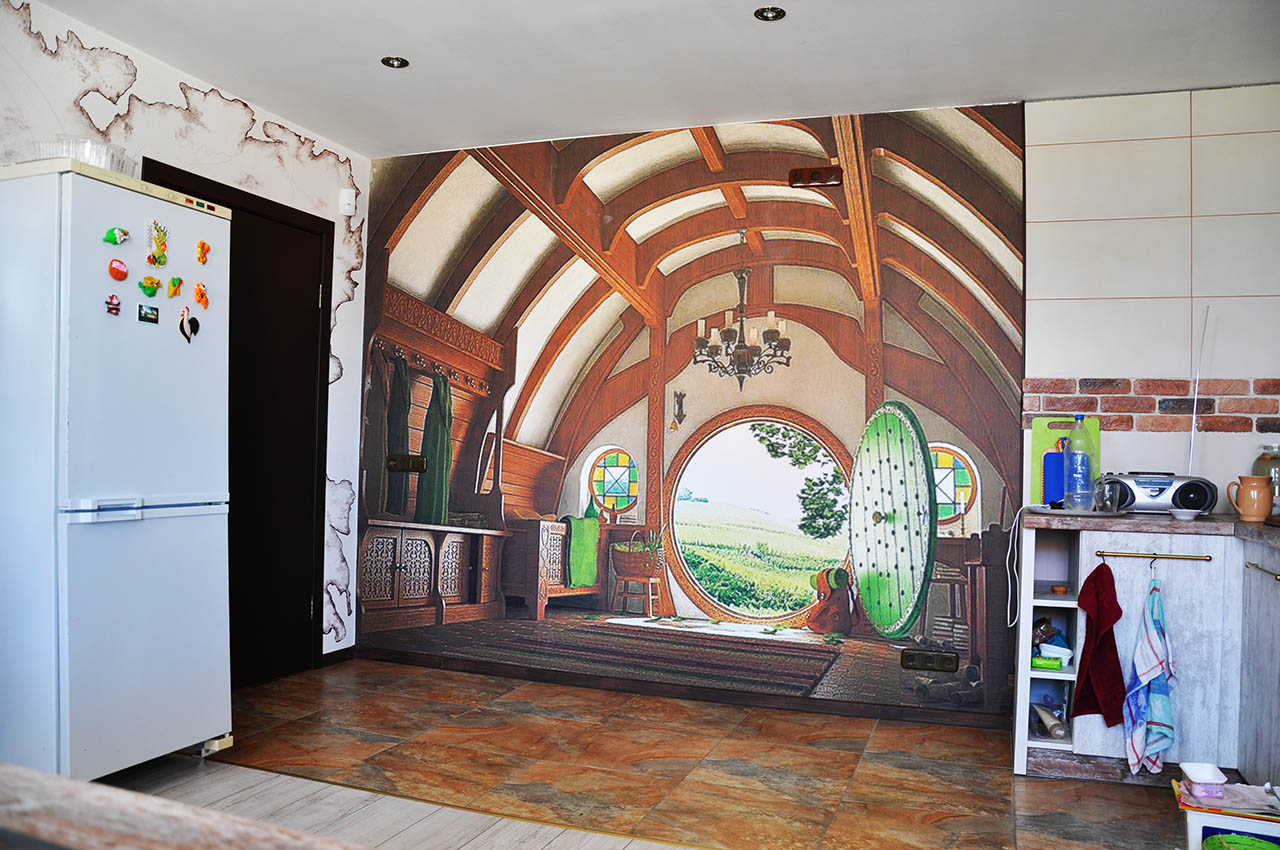 Внутри дома реализовали несколько интересных решений. Кухню обставили в стиле кинотрилогии «Властелин колец», фотообои «жилище хоббита» подбирали так, чтобы они зрительно расширяли пространство кухни. Печка — декоративная.