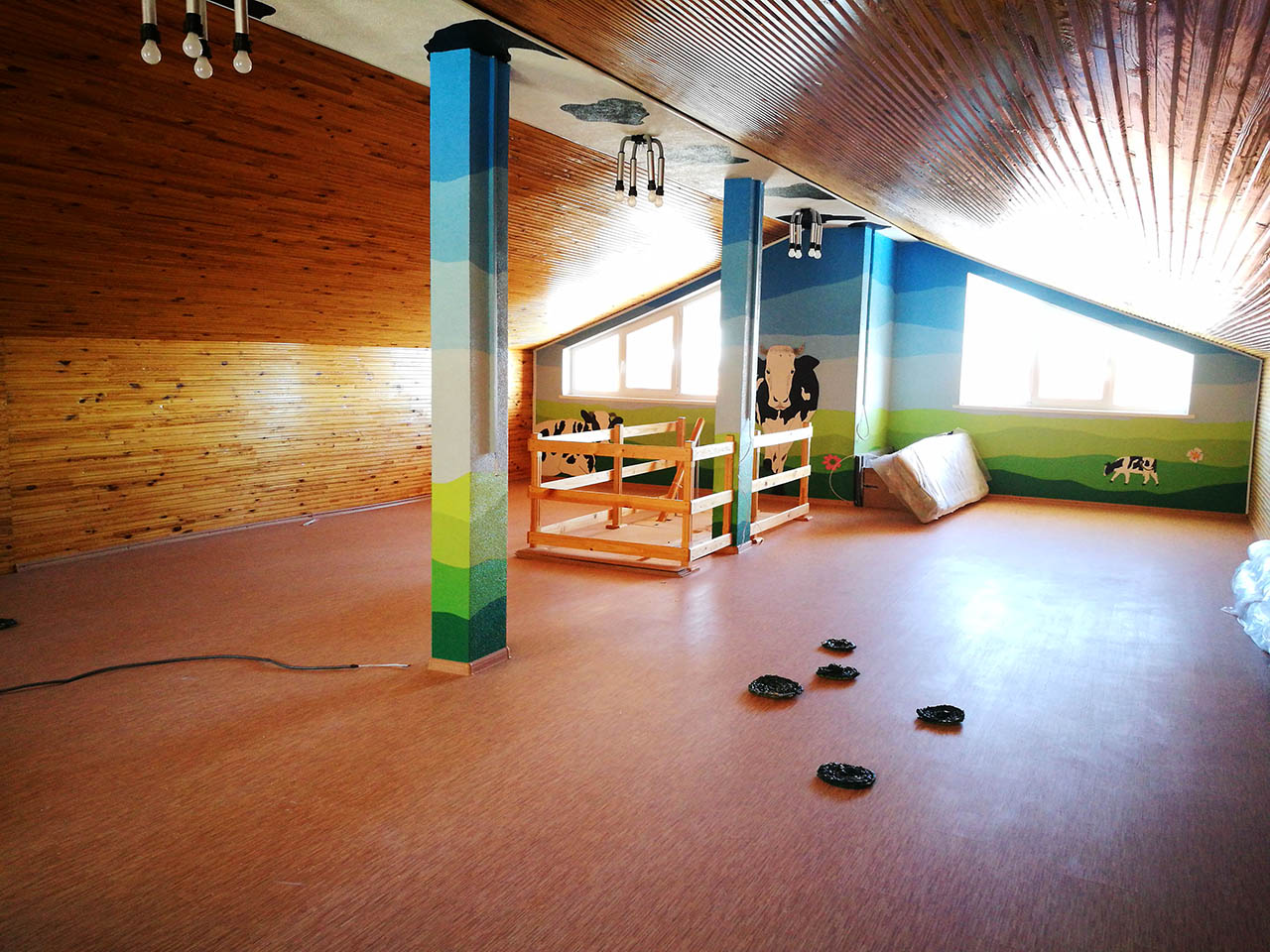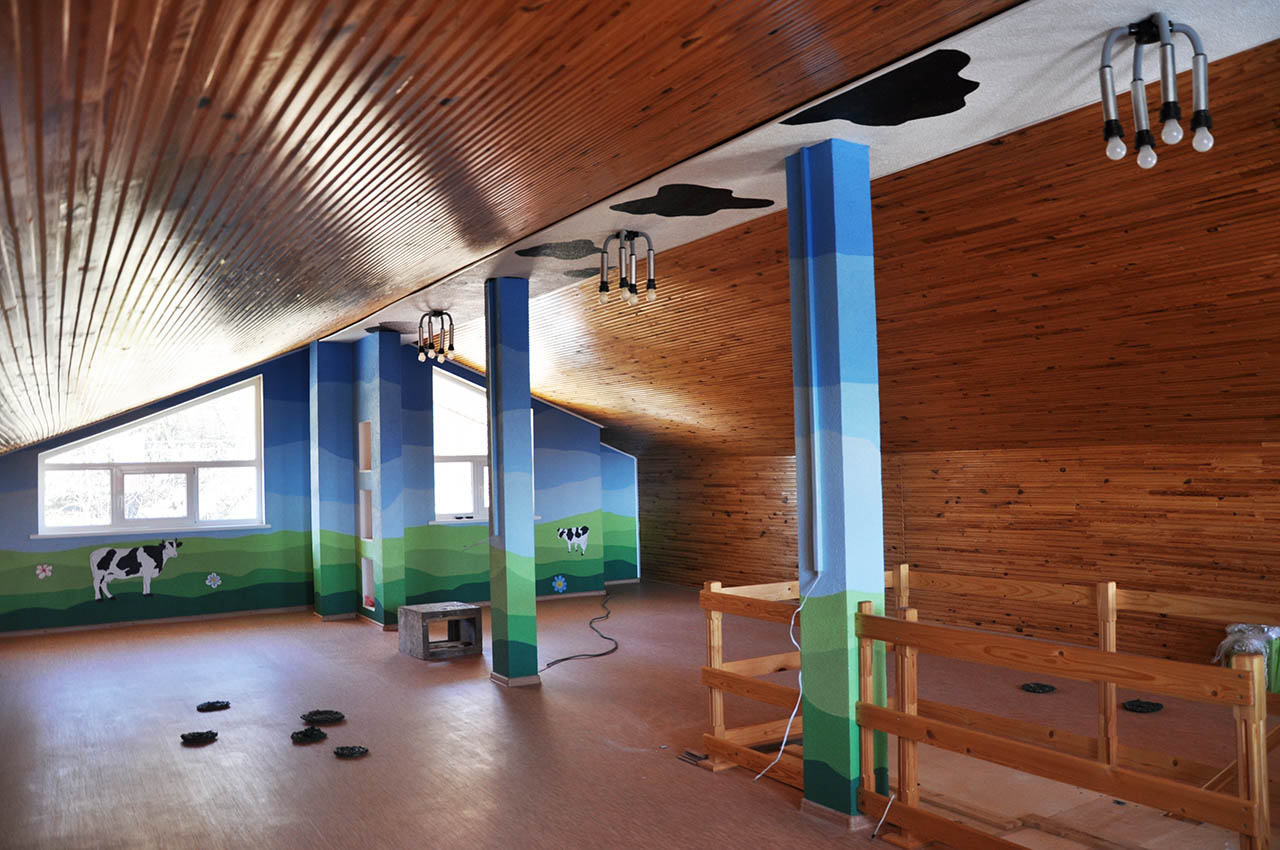 Мансардный этаж обшили вагонкой-короткомером, она дешевле стоила, чем полноразмерная. Мансарду стилизовал под сельхозтематику: коровы, светильники в виде доильных аппаратов, даже мелкие детали на полу — чтоб уж совсем аутентично было (улыбается. — Прим. ред.).