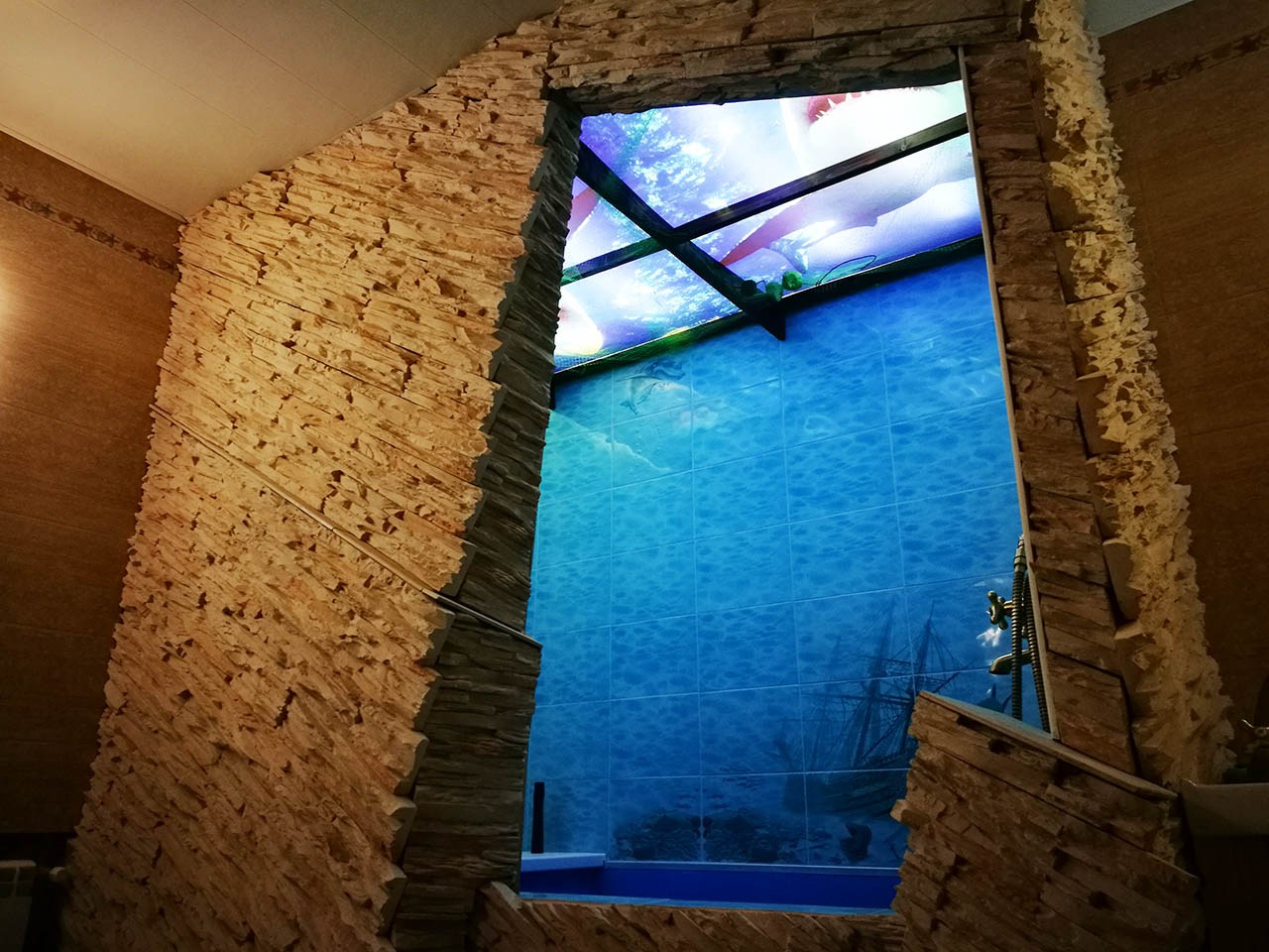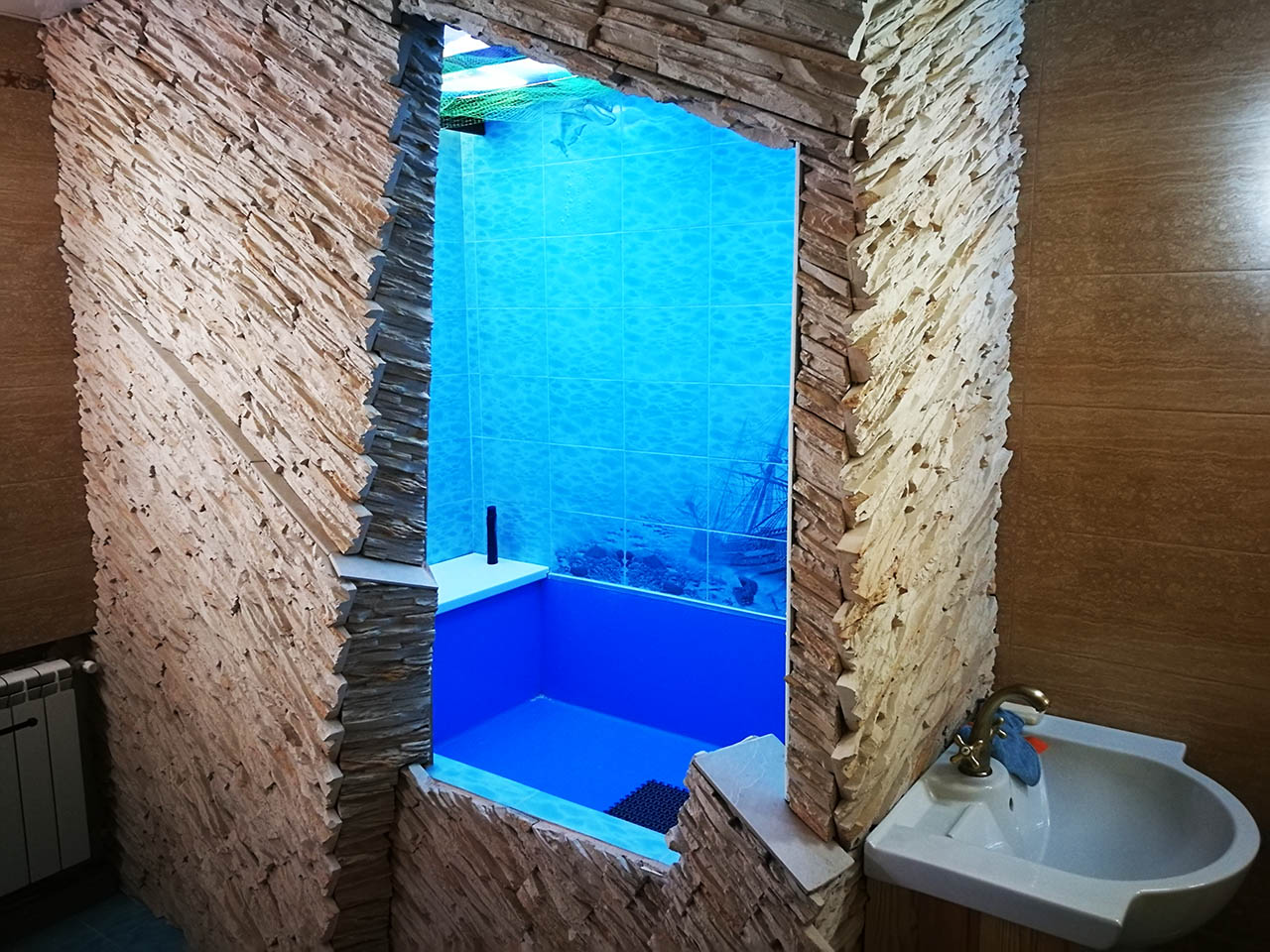 Ванну-душевую делали сами, особо крупных размеров — чтобы можно было купать пса породы ньюфаундленд. Захотелось оформить ее оригинально, поэтому я облицовочный камень укладывал на «природный» манер, чтоб создавалось впечатление слоистой каменной породы.