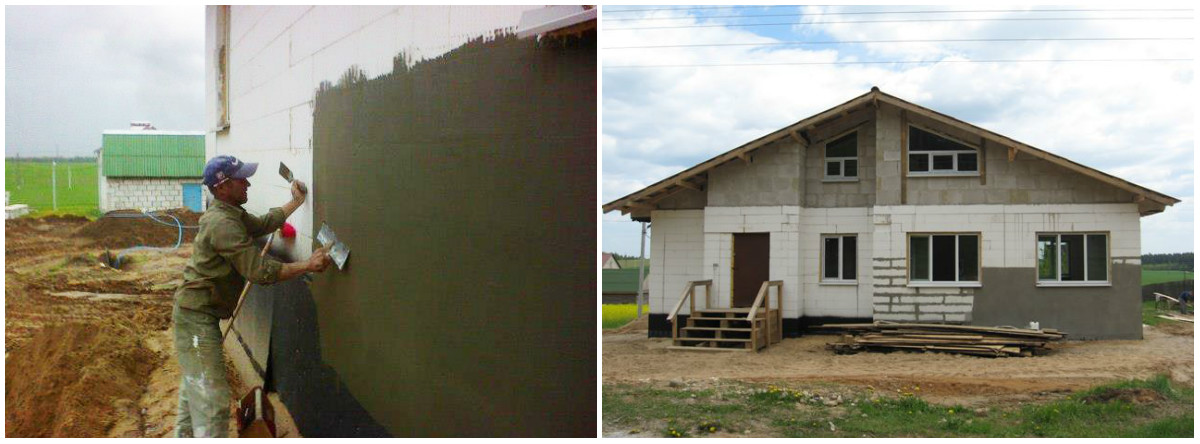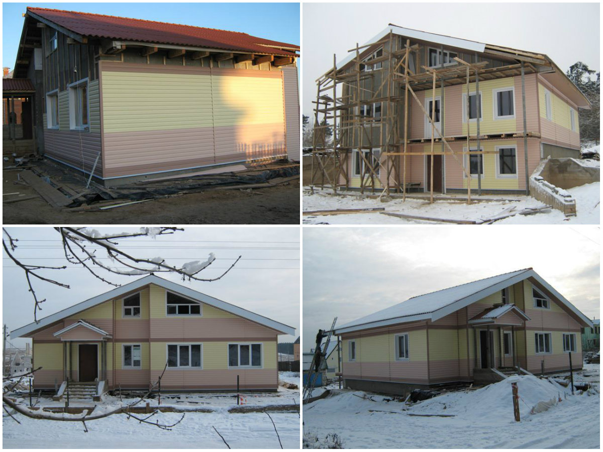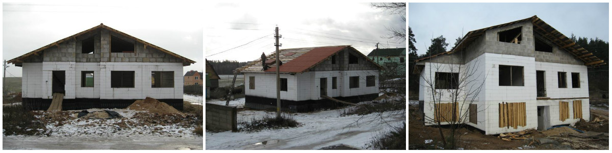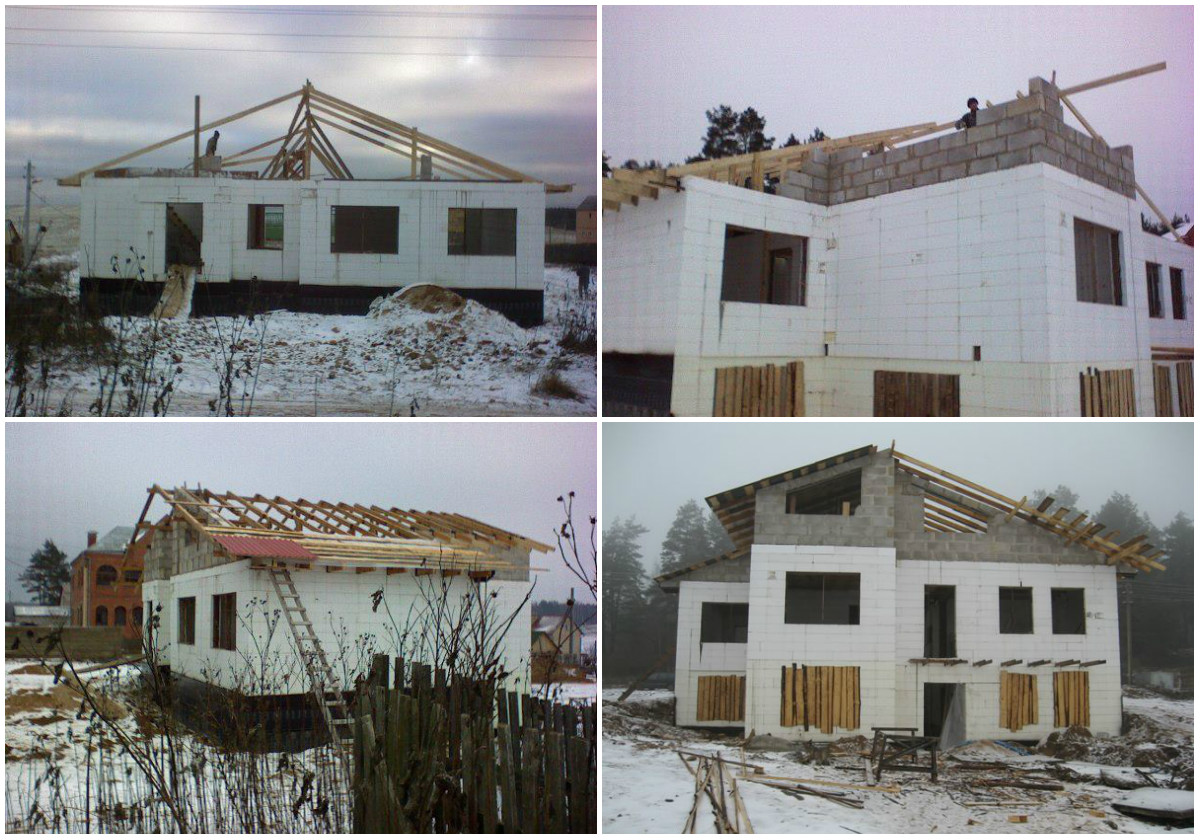 Когда закончили возведение второго этажа, уже начинал идти снег, требовалось быстро накрыть крышу. Бетон по такой погоде уже не схватился бы, поэтому фронтоны сделали из газосиликатных блоков.