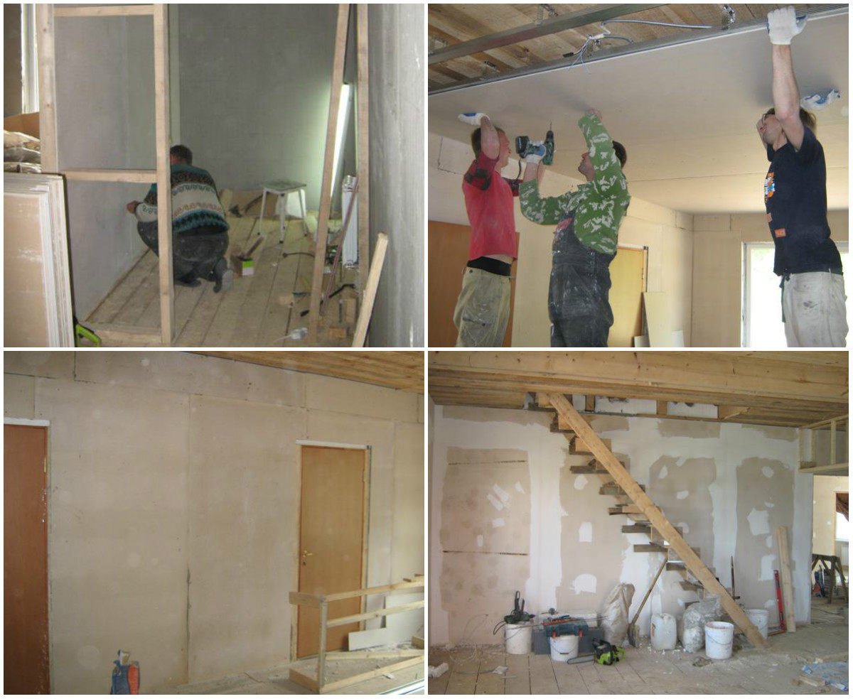 Внутри все помещения отделаны стекломагнезитными плитами. Мы их выбрали вместо гипсокартона по причине большей прочности материала и его устойчивости к влаге. Но стекломагнезит тоже нужно класть на обрешетку из металлопрофиля: к стенам, особенно внешним, нельзя укладывать плиты прямо на клей. Зимой плиту может начать «крутить» из-за разницы температур с внешней и внутренней плоскостей. Мы не соблюли технологию, поверили словам девушки-маркетолога, убедившей нас в монолитности стекломагнезита, и уложили просто на клей. В результате с приходом отопительного сезона в нескольких местах плиты начало крутить, пришлось срочно проходить все помещения, и все плиты укреплять анкерами. Анкеров потребовалось много, но, к счастью, успели.