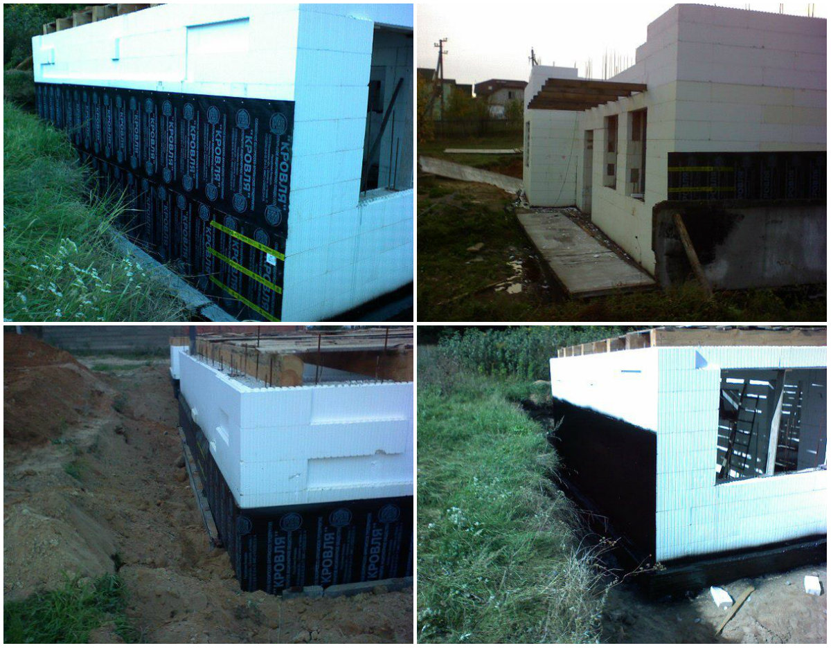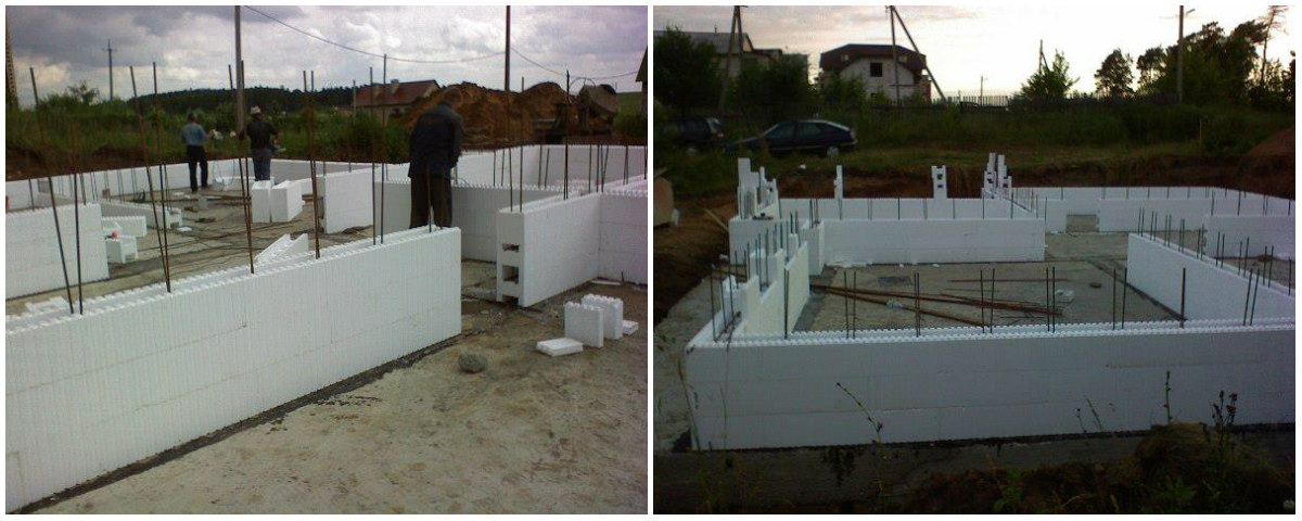 На фундаменте начали возводить стены. Выкладывали поэтапно, «полосами» высотой в 75 сантиметров. Поставил три ряда блоков по 25 см, арматуру горизонтально — положил, вертикально — поставил, перевязал проволокой, залил бетон ведрами. На следующий день опять можно ставить блоки, а через 2-3 дня, когда схватится бетон предыдущей заливки, можно новый ряд сверху лить. Сами блоки — полые внутри, две стенки соединены перемычками (чтобы стенки не порвало под весом залитого бетона). Но если от готовой стены пенополистирол оторвать — за ним будет монолитная стена порядочной толщины. Судите сами: пенопласта снаружи —10 см, внутри — 5см, плюс 15 см бетона, итого — стена толщиной 30 см. Никакого дополнительного утепления такая уже не требует. Пенополистирол плотный, прочный сам по себе — это не тот пенопласт, в который телевизоры упаковывают.