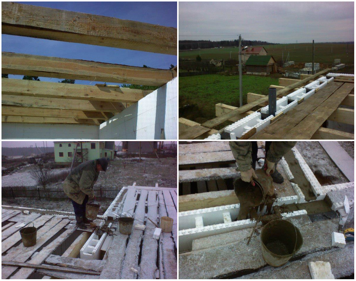 По технологии между этажами можно укладывать и бетонные перекрытия, но мы ограничились более легкими — из шпального бруса 16х23см. Брус я забирал сразу с пилорамы, еще не попиленный, длиной около 6 метров. В стене мы под эти шпалы вырезали отверстия, прямо в блоке, надевали сверху на шпалу, и затем уже заливали бетон. Снизу шпал — черновая доска, застланная черным пергамином, сверху — засыпной утеплитель между брусьев (керамзит), черновая доска, на нее — фанера, а на фанеру (уже при внутренне отделке) — ламинат.