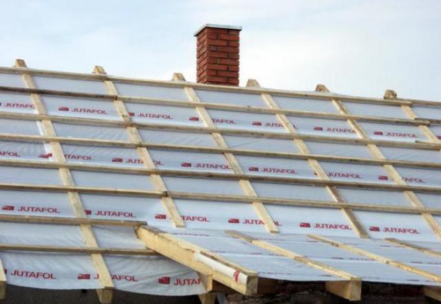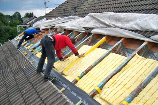 С внешней стороны теплоизолятора обустраивается гидробарьер. Его назначение — не дать влаге проникнуть в волокно со стороны кровли, если она вдруг даст течь. Пленка-гидроизолятор накладывается на обрешетку, набиваемую на стропила. В отличие от базальтового волокна, стекловолокно чаще используется для утепления перегородок и внутренних стен.