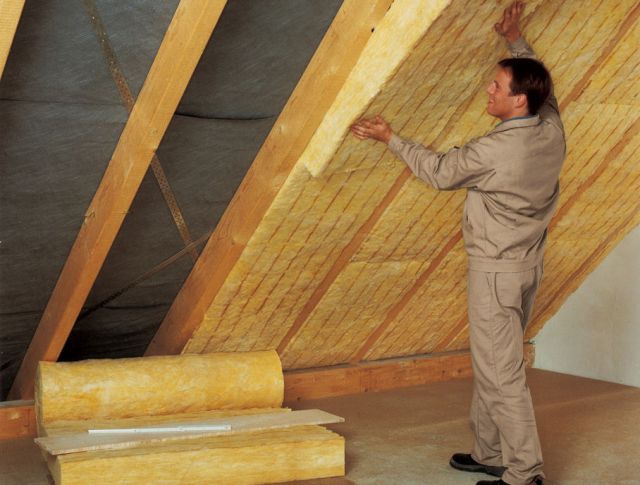 Теплоизоляционный мат из базальтового волокна укладывается непосредственно между стропил, его упругости достаточно для того, чтобы прочно удерживаться между этими элементами крыши. Но для обеспечения большей надежности и долговечности можно произвести их обшивку изнутри гипсокартонном или фанерой.