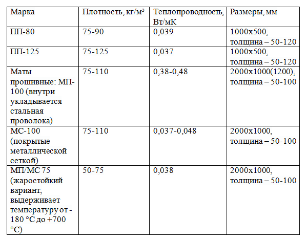 У них плотность 100 кг/м³, теплопроводность – 0,035-0,086 Вт/мК, все зависит от температуры эксплуатации (от -180 °C до +400 °C). Размеры: длина – 1000 или 500 мм, толщина варьируется от 30 до 100 мм.
