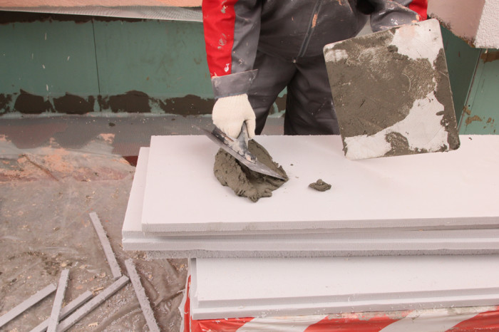 Клеевой состав наносится на пенополистирольные плиты зубчатым шпателем. Для этого обрабатывается периметр, и наносится клей точечно по остальной поверхности. Но лучше, если клеевым раствором обработать стену снаружи.