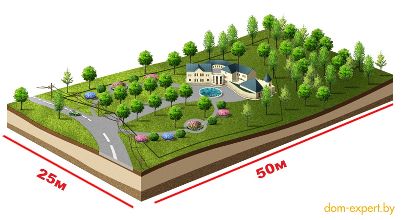 Расчет будем делать для обыкновенного участка, 25 на 50 метров, на относительно ровном рельефе. От улицы планируем поставить калитку (ширина 1 м) и откатные ворота (3,5 м). На противоположной стороне расположен хозяйственный проезд. Там тоже будут калитка и распашные ворота (4м). За вычетом ширины калиток и ворот (1м+1м+3,5м+4м= 9,5м) получаем 140,5 м периметра. Высота забора − полтора метра.