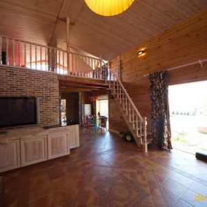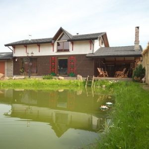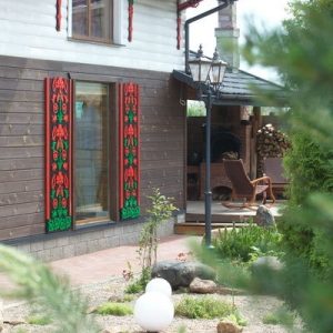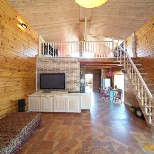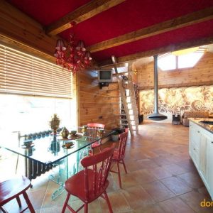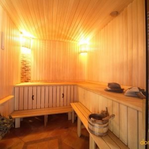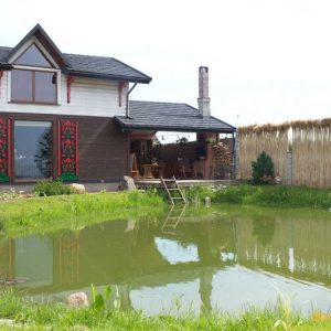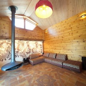 В противовес европейскому шику основного дома интерьер этих помещений решен с изрядной долей иронии по поводу «русской клюквы» – это и обилие красного, и розы на текстиле, и резной стол с самоваром, и сундук с добром, и пышная кустодиевская купальщица в зоне парной. Вместо печи – ультрасовременный камин из закаленной оружейной стали. И даже «ковер, заморской, персианский» имеет место быть. Из окон в пол открывается вид на пруд. Так что первые слова при виде этого изобилия: «Барин приехал!». И даже деревянная обшивка стен, вполне традиционная для банных комплексов, здесь в первую очередь работает на ассоциацию с купеческим теремом.