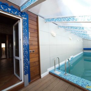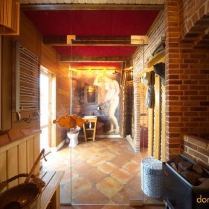 В характере владельца неуемная тяга к путешествиям, перемене мест. И чтобы он мог ее хотя бы отчасти удовлетворить, не покидая при этом своего участка, отделка банного комплекса выполнена в абсолютно другой манере.