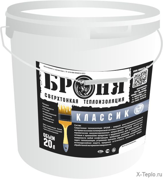 Такое сочетание компонентов придает утеплителю гибкость и хорошую цепкость с утепляемой поверхностью. По своей консистенции «Броня» имеет много общего с обычной белой краской. После высыхания на поверхности образуется эластичное покрытие, которое обладает высокими антикоррозийными и термическими свойствами.